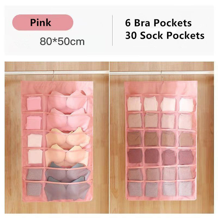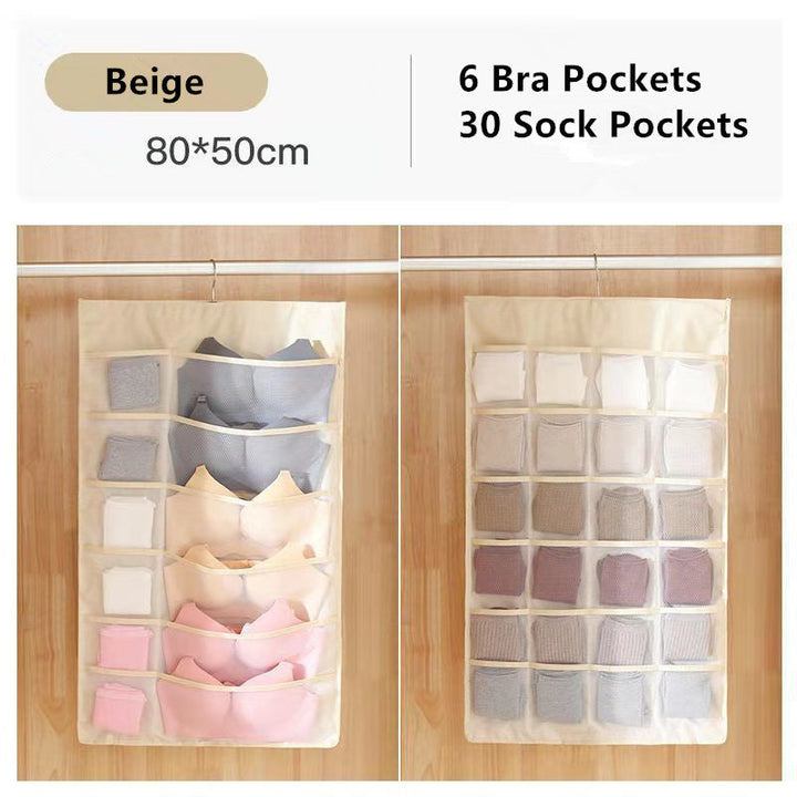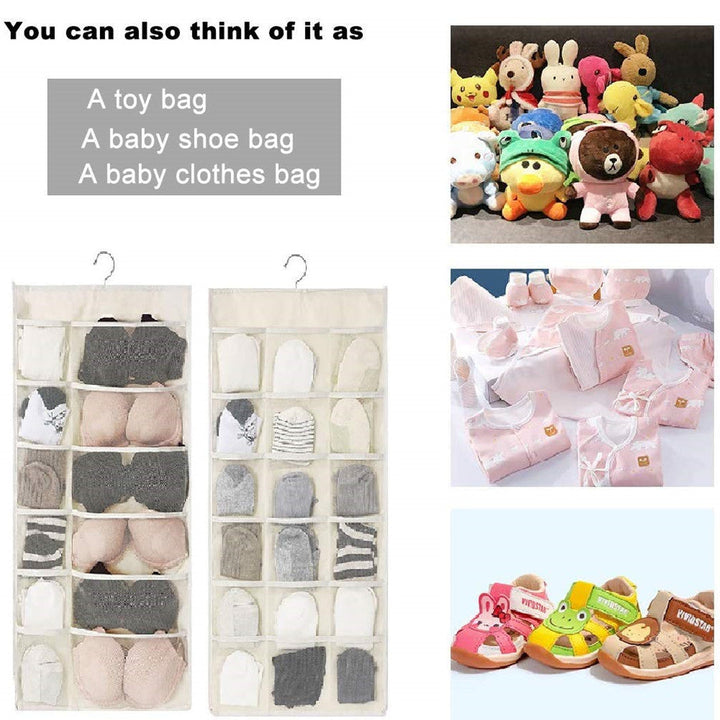 Our hanging organizer is all made out of oxford fabric + gridding cloth, no wrinkles. We refuse to blend transparent plastic material, it is well know that the plastic is easy to age and discolor. 30 pockets (pocket on both sides) hanging organizer is reasonable structure, wear resistant washable and compression does not wrinkle, novel design, no smell, skin-friendly, safety and green, suitable for all age.