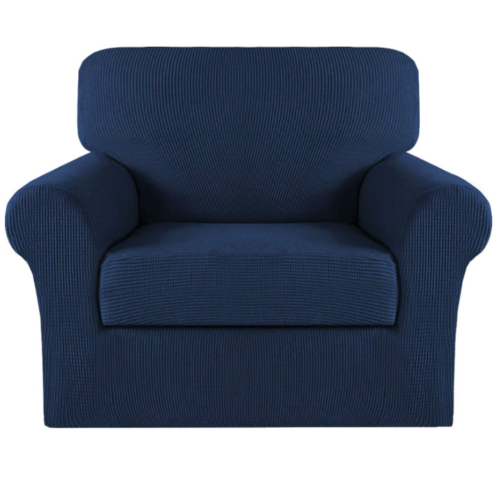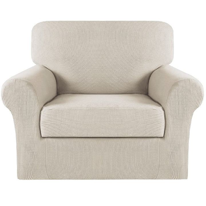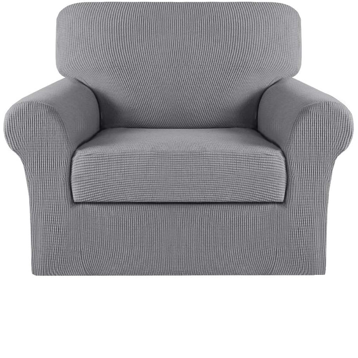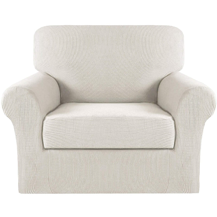 Overall, this is a great armchair cover! It was super easy to put on. The cushion part just went right over and fit great once put into the seat. The main armchair part, I had on backwards but then realized the two tags went in back. Once I got it on, it fit perfectly. Just some stretching and tucking.