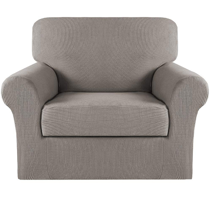 The cover fits great, its nice and stretchy! I bought this chair at a thrift store but wasn't too crazy about the pattern and it has some wear discoloration that i couldnt get out so this solved my issue ! I love that it comes in two pieces, makes for a cleaner looking fit. The sides are a little baggy bc of the style of the chair, but overall I'm very happy with it!