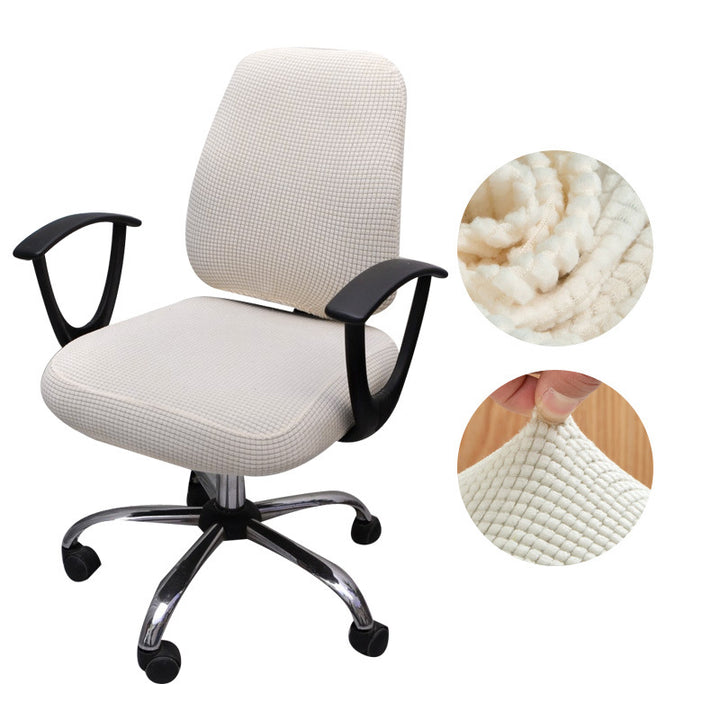 I just got this delivered and took me seconds to install! I have a thick velvet desk chair with a curved back and flat front and it was able to fit just fine!! It's stretchy, so I just tucked it into the border of my seat. Just tucked them in like a fitted sheet!