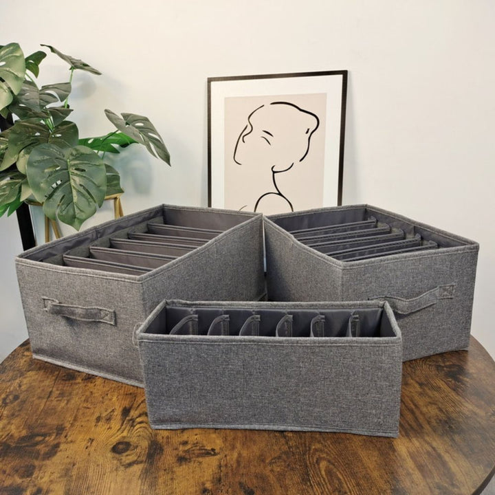 Clothes organiser for storing jeans, leggings, underwear, socks, scarves, ties, skirts, T-shirts, etc. Seven dividers can sort your clothes and store them neatly, creating a tidy living space.