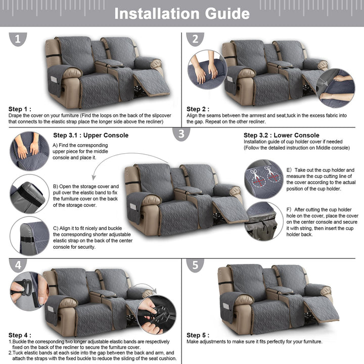 Installation & Care: Couch covers for reclining couches installation is effortless. Please refer to our 2 seat recliner covers detail page for the installation guide to ensure a perfect fit. Machine washable, gentle wash, do not bleach and iron.