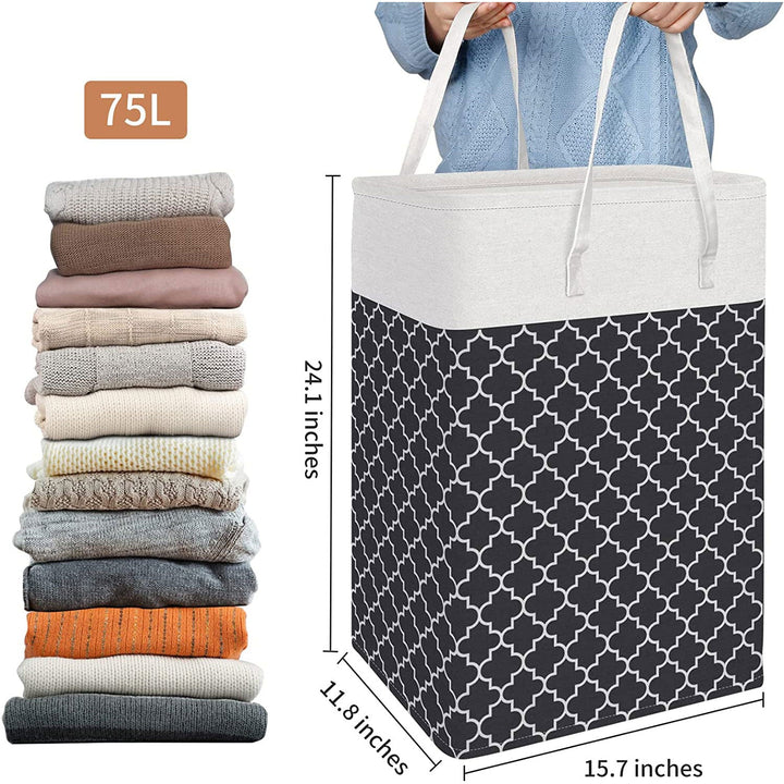 The clothes bin measures 15.7"*11.8"*24.1" (length*width*height) and the capacity is 75L. Such a tall storage basket can store dirty clothes, toys, pillows, quilts and blankets. It is suitable for university dormitories and camping, or for travelers, apartments, hotels, baby nurseries, utility rooms and shopping.