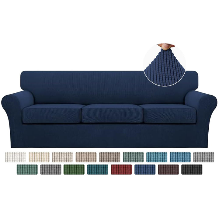 It's been a long while that we've had our living room sofa and it is still in great shape. Replacing it wasn't necessary, but it was time for a 'new look'. This was a very affordable way to accomplish that. I am so very pleased with this set. I chose the navy blue and upgraded to thicker fabric. Quality of fabric is very nice. This set has the separate covers for the seat cushions so the finished look is very custom in appearance. Fit is nice and snug and stays 'put' even after sitting on it. I did not rate it for 'easy to clean' as it is brand new. I would highly recommend this vendor and product to anyone!