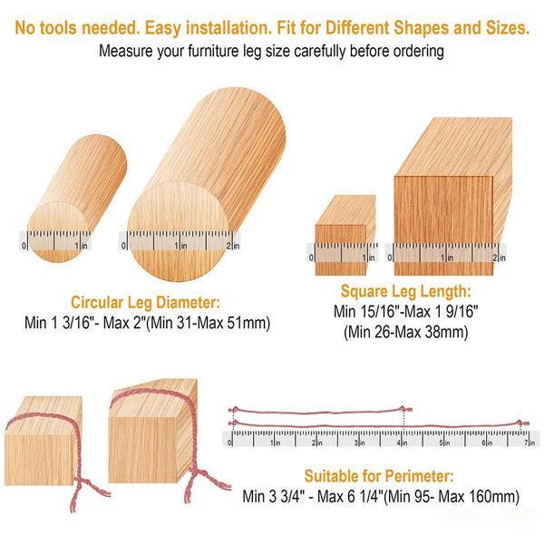- Universal Fit: Suitable for chair legs with perimeter of 3 3/4" to 6 5/16" (95-160mm). Circular diameter 1 3/16" to 2" (30-50mm). Square length 15/16'' to 1 9/16" (24-40mm). Please measure the diameter of your furniture legs before purchasing. Our chair leg caps are suitable for round and square furniture feet and other shapes, such as restaurant chairs, bar stools, patio chairs, kitchen chairs, storage cabinet, metal bistro chairs etcchair etc.