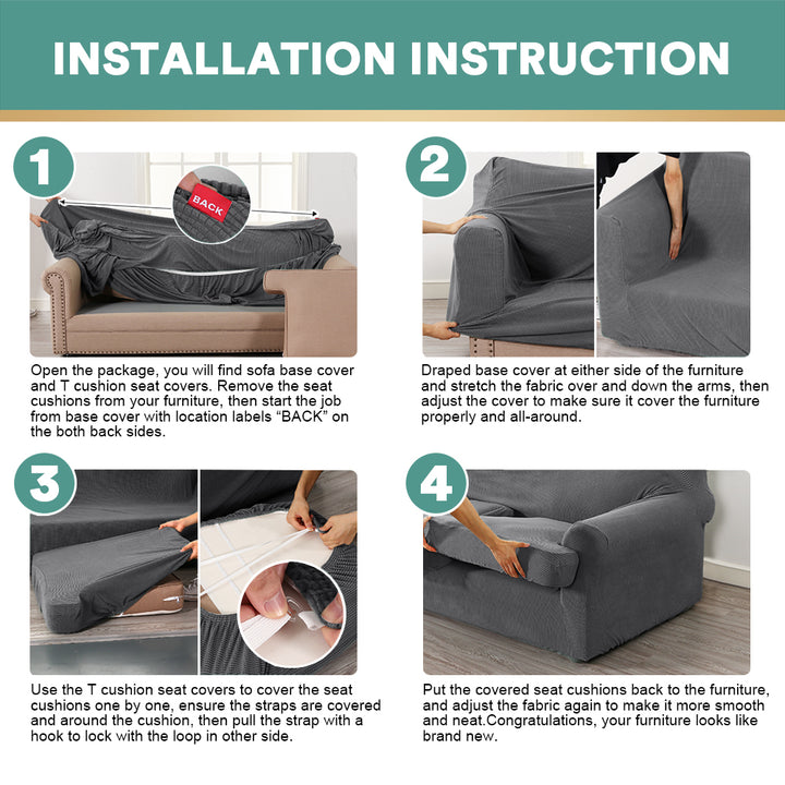 STAY IN PLACE: Non-skid thick elastic bottom prevents sliding. And in order to better stay in place, the bottom of cover add three additional elastic straps, except box cushion. Our T cushion slipcovers could stay tight with no snag, no wrinkling, shifting or slipping even on both leather sofa and cloth. It is very easy to put on and take down. (Installation Instructions Included)