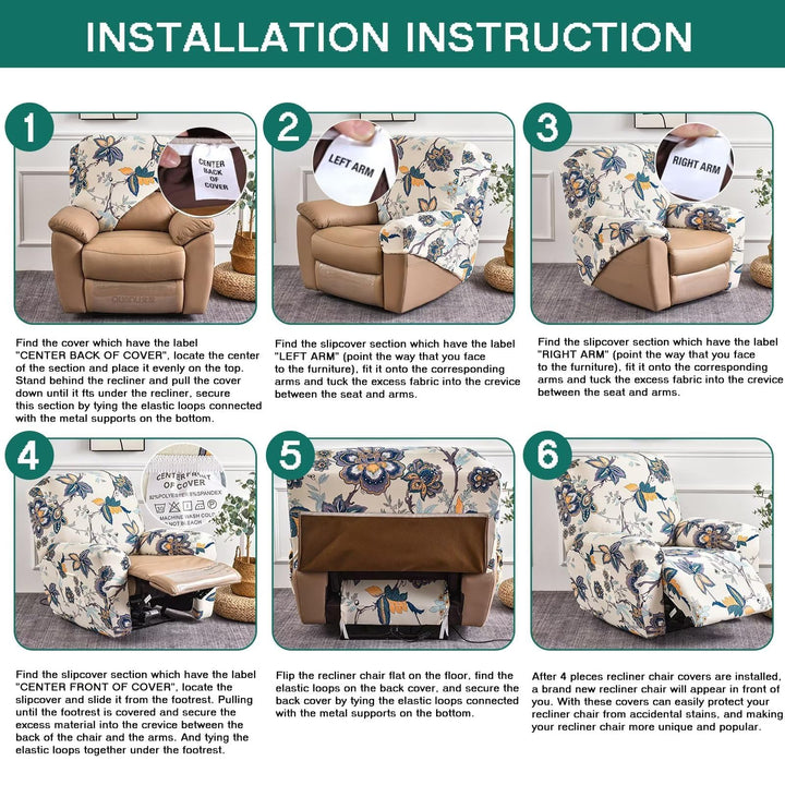 【EASY TO INSTALL AND CLEAN】: Following the step-by-step installation guide in the recliner cover pack or in the pictures, you will be able to install the reclinable recliner cover independently very easily. achine washable, wash alone in cold water or below 30℃ water , use gentle cycle. Do not bleach or iron, hang to dry.